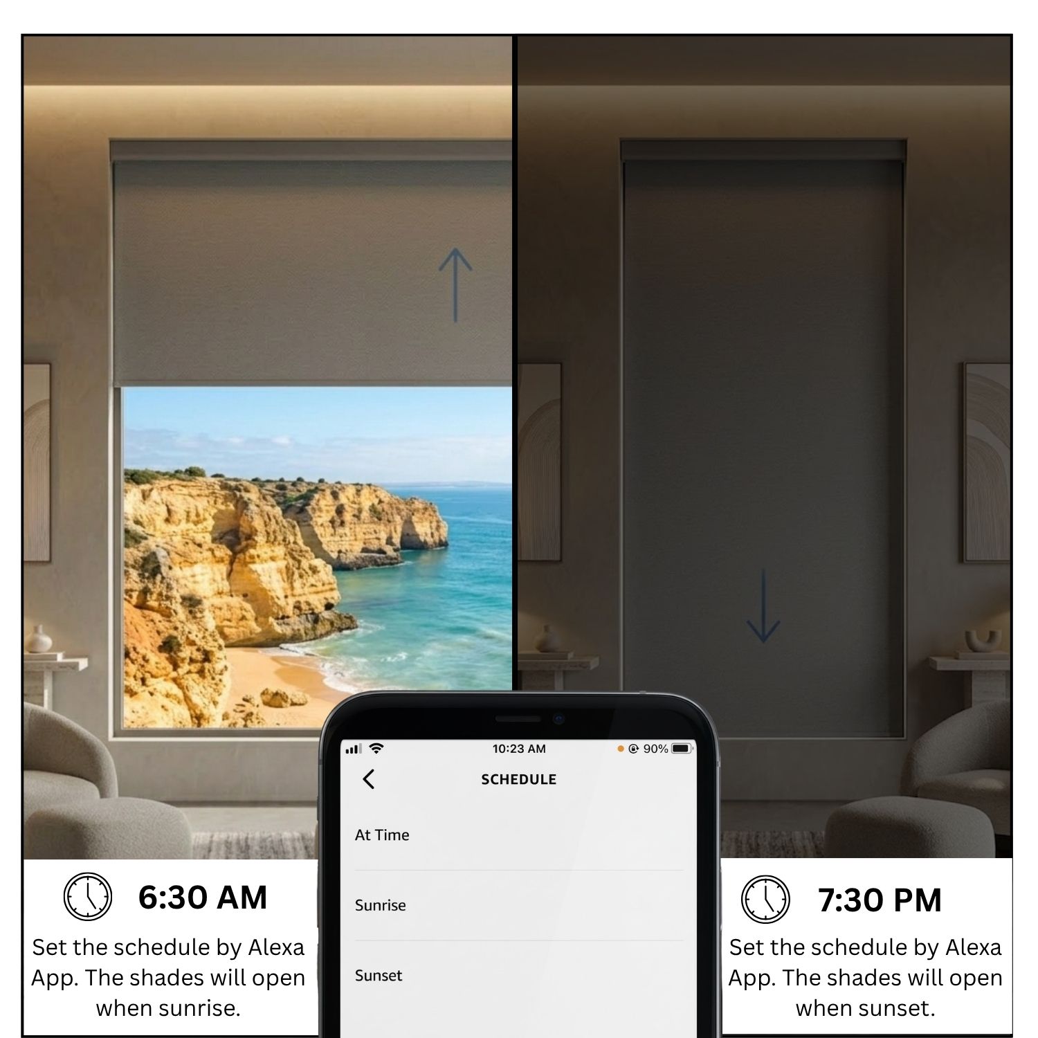 Seamlessly sync your shades with other Matter-certified devices for an integrated home experience. With the Sunrise/Sunset mode, your blinds can rise with the morning light and close at dusk, aligning naturally with your daily rhythm.