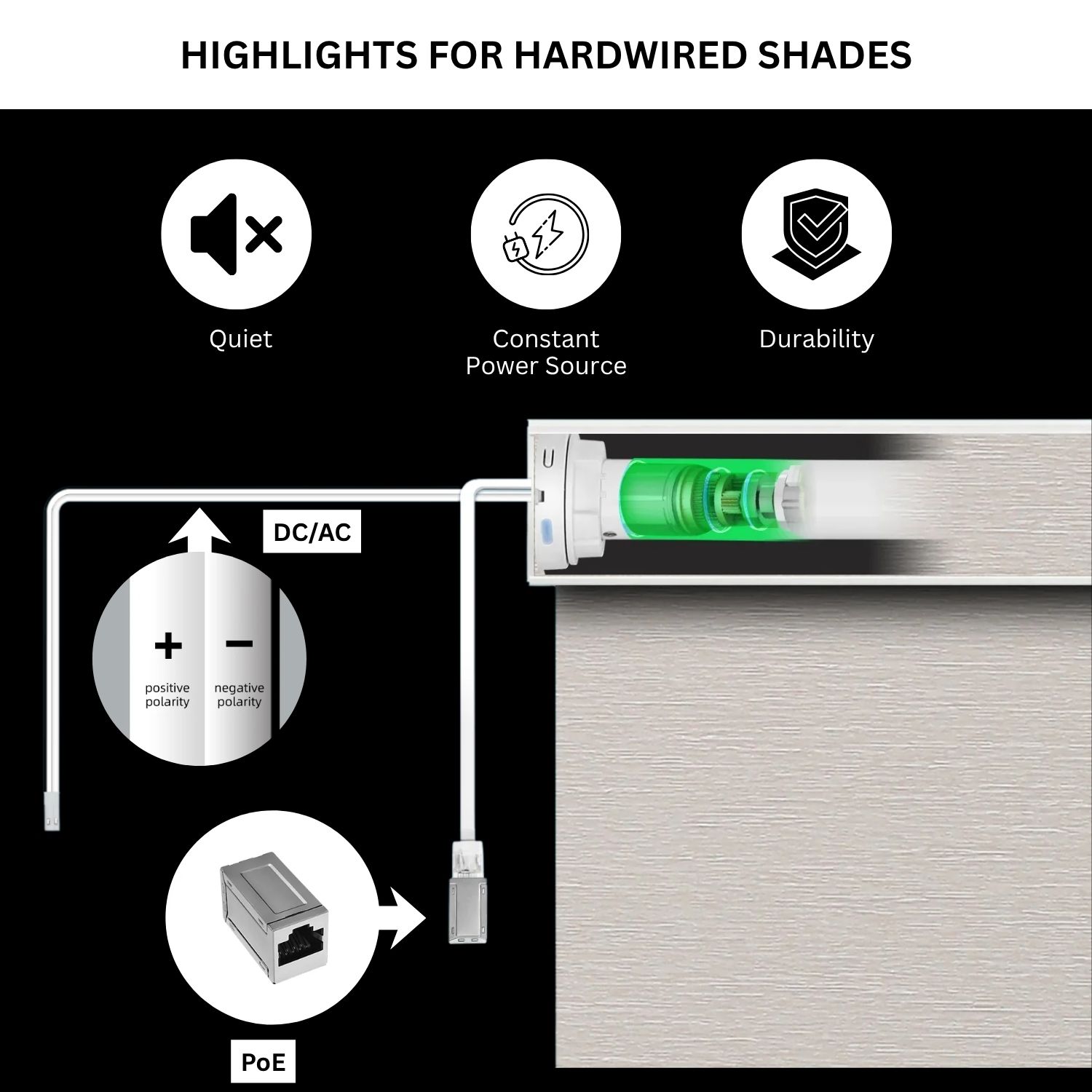 Coastal Blinds offers a complete range of hardwired roller shades, available in both traditional DC/AC motor options and advanced PoE (Power over Ethernet) solutions, giving you flexible choices for any space or setup.