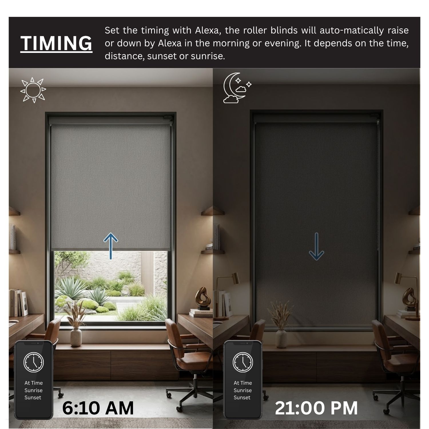 Seamlessly sync your shades with other Matter-certified devices for an integrated home experience. With the Sunrise/Sunset mode, your blinds can rise with the morning light and close at dusk, aligning naturally with your daily rhythm.