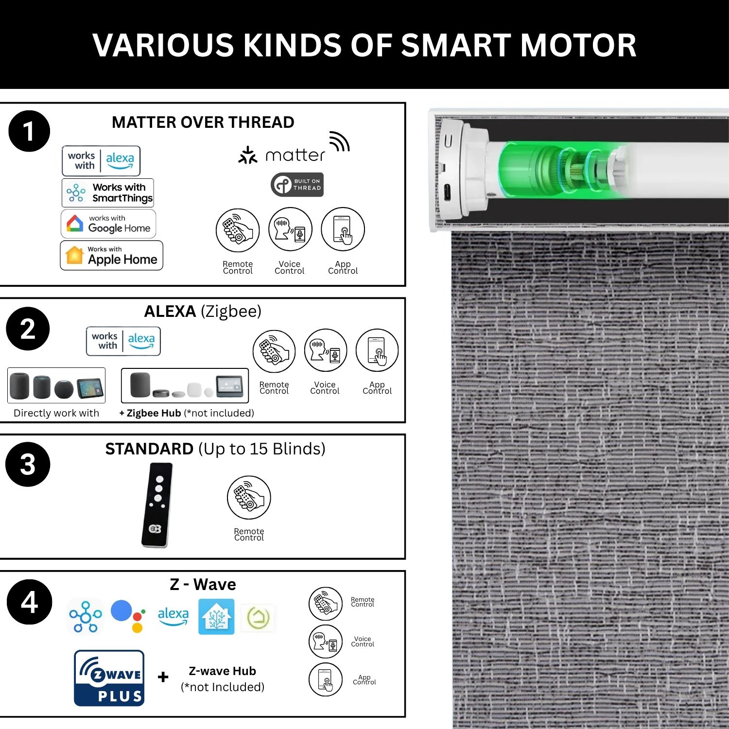 At Coastal Smart Blinds, we offer a versatile selection of motorized systems designed to integrate effortlessly with your smart home. Our Zigbee and Z-Wave motor options are compatible with leading platforms like Samsung SmartThings, Home Assistant, and Hubitat, giving you simple, centralized control at your fingertips. At the heart of our technology lineup is the Matter motor, a next-generation solution built on the Matter over Thread protocol.