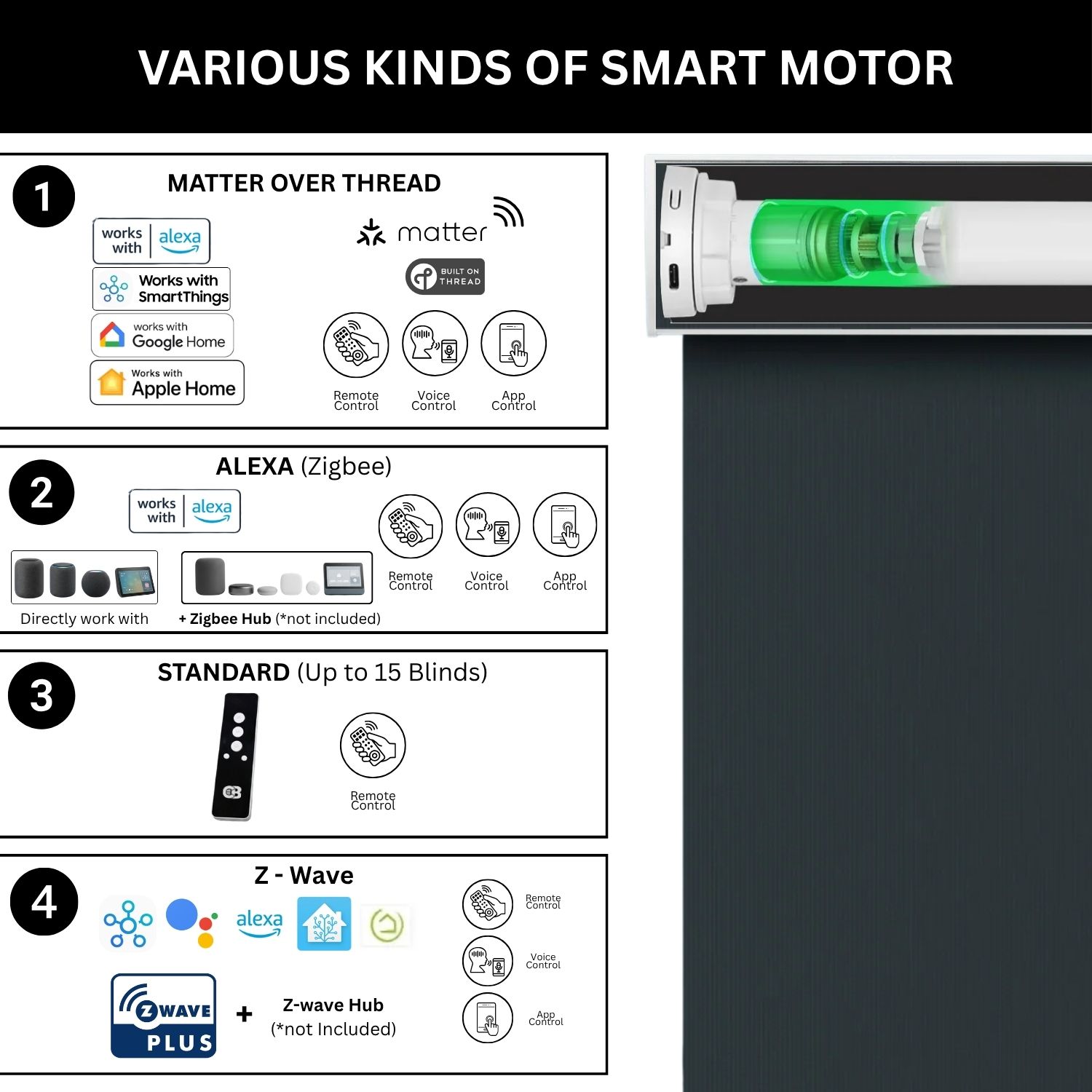 At Coastal Smart Blinds, we offer a versatile selection of motorized systems designed to integrate effortlessly with your smart home. Our Zigbee and Z-Wave motor options are compatible with leading platforms like Samsung SmartThings, Home Assistant, and Hubitat, giving you simple, centralized control at your fingertips. At the heart of our technology lineup is the Matter motor, a next-generation solution built on the Matter over Thread protocol.