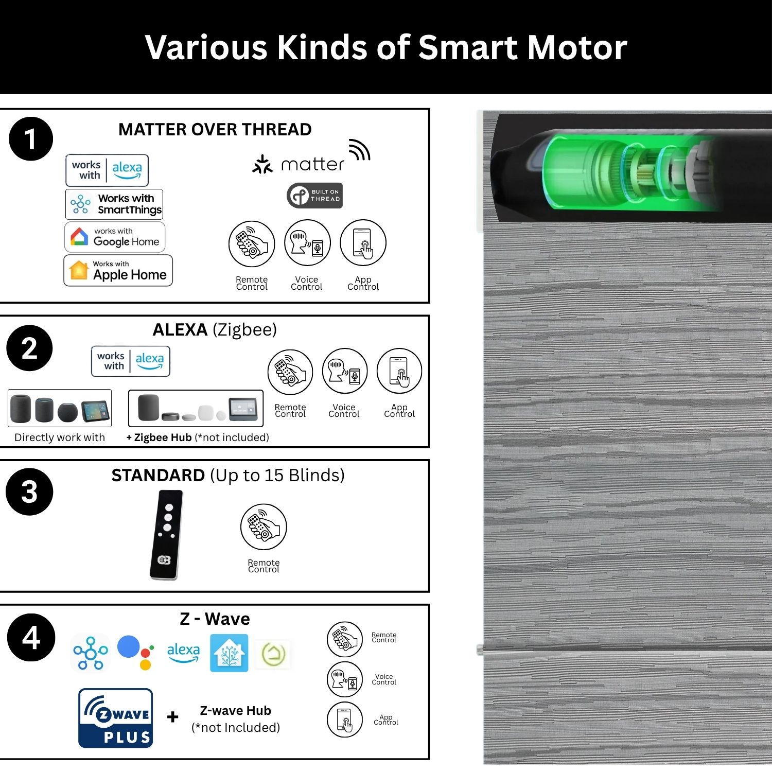 At Coastal Smart Blinds, we offer a versatile selection of motorized systems designed to integrate effortlessly with your smart home. Our Zigbee and Z-Wave motor options are compatible with leading platforms like Samsung SmartThings, Home Assistant, and Hubitat, giving you simple, centralized control at your fingertips. At the heart of our technology lineup is the Matter motor, a next-generation solution built on the Matter over Thread protocol.