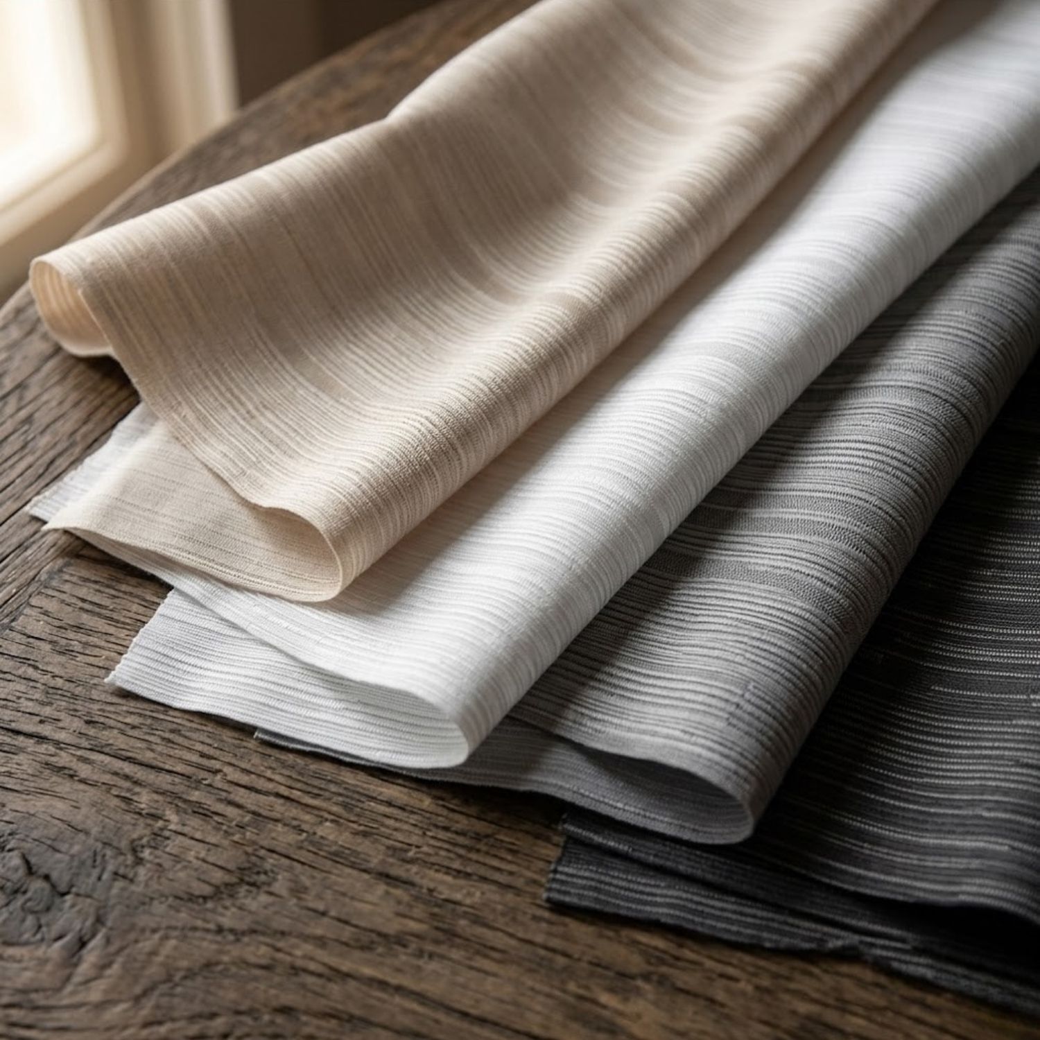 This fabric has a fine woven texture with gentle horizontal lines across the surface. The soft layers in the pattern create a feeling of depth and calm beauty. As light hits the fabric, you can see a nice mix of light and shadow. Its simple, clean design brings a sense of quiet luxury and works well in any room. Both modern and timeless, this fabric is easy to match with many home styles.