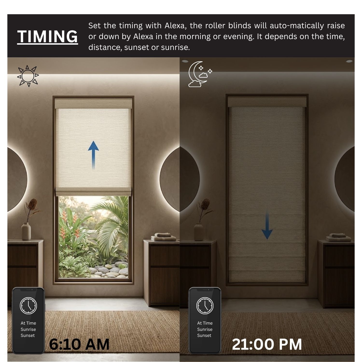 Seamlessly sync your shades with other Matter-certified devices for an integrated home experience. With the Sunrise/Sunset mode, your blinds can rise with the morning light and close at dusk, aligning naturally with your daily rhythm.