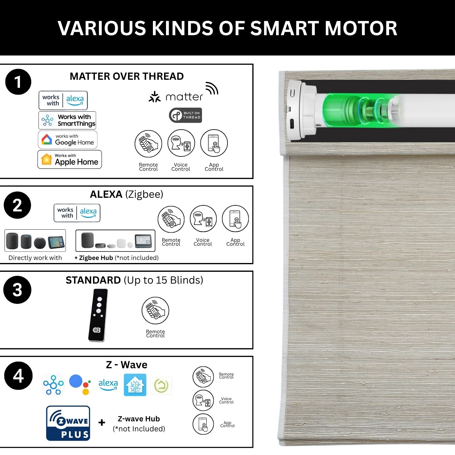 At Coastal Smart Blinds, we offer a versatile selection of motorized systems designed to integrate effortlessly with your smart home. Our Zigbee and Z-Wave motor options are compatible with leading platforms like Samsung SmartThings, Home Assistant, and Hubitat, giving you simple, centralized control at your fingertips. At the heart of our technology lineup is the Matter motor, a next-generation solution built on the Matter over Thread protocol.