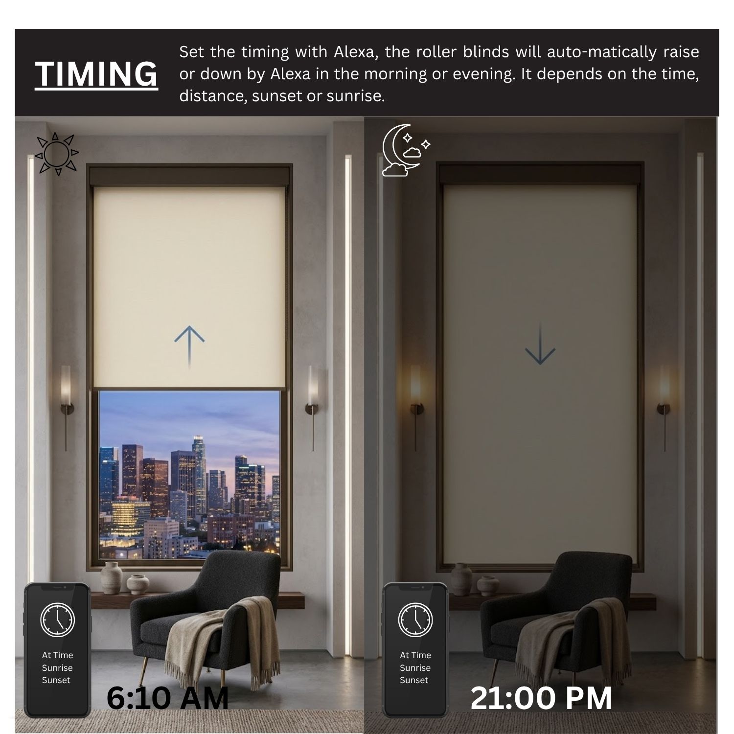 Seamlessly sync your shades with other Matter-certified devices for an integrated home experience. With the Sunrise/Sunset mode, your blinds can rise with the morning light and close at dusk, aligning naturally with your daily rhythm.