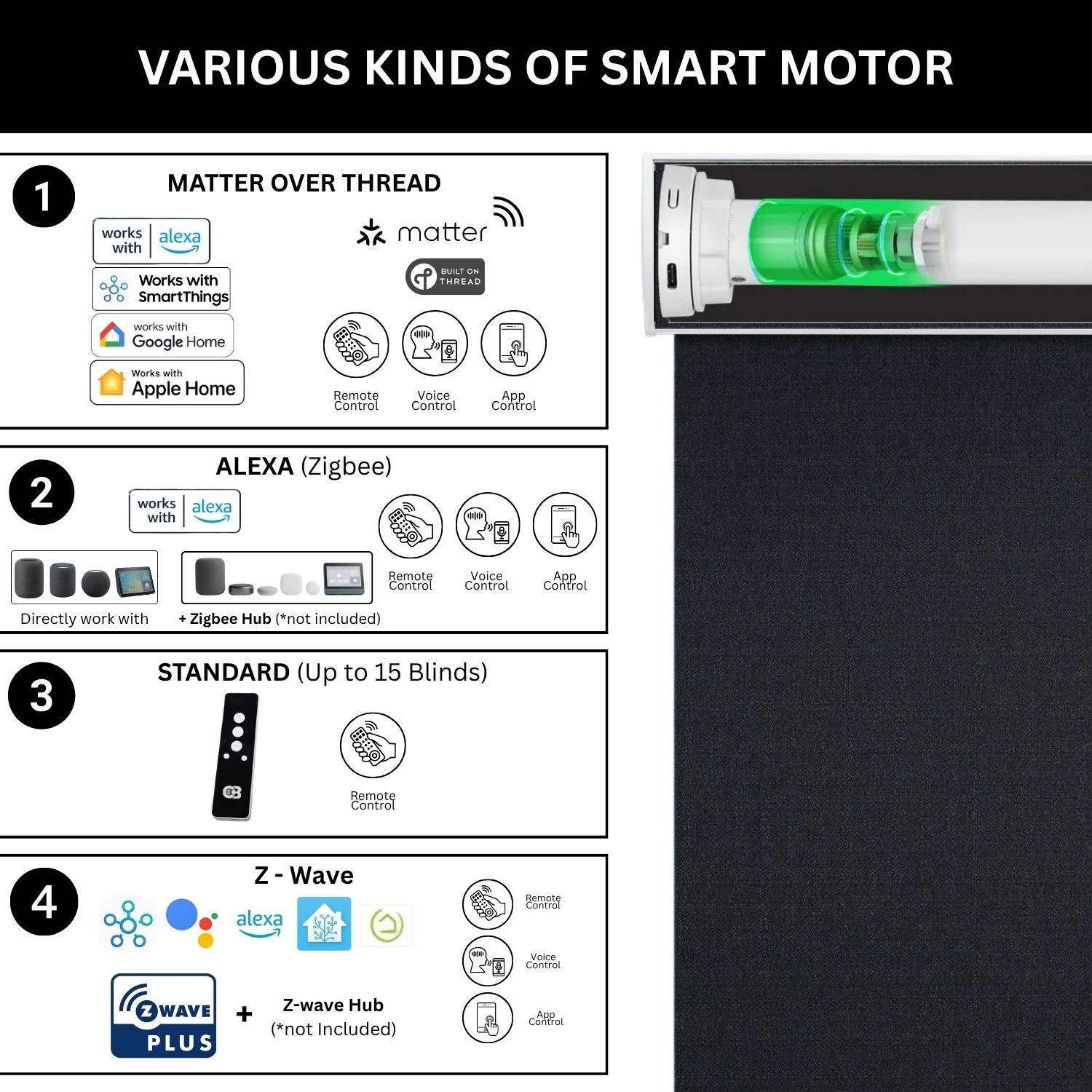 At Coastal Smart Blinds, we offer a versatile selection of motorized systems designed to integrate effortlessly with your smart home. Our Zigbee and Z-Wave motor options are compatible with leading platforms like Samsung SmartThings, Home Assistant, and Hubitat, giving you simple, centralized control at your fingertips. At the heart of our technology lineup is the Matter motor, a next-generation solution built on the Matter over Thread protocol.