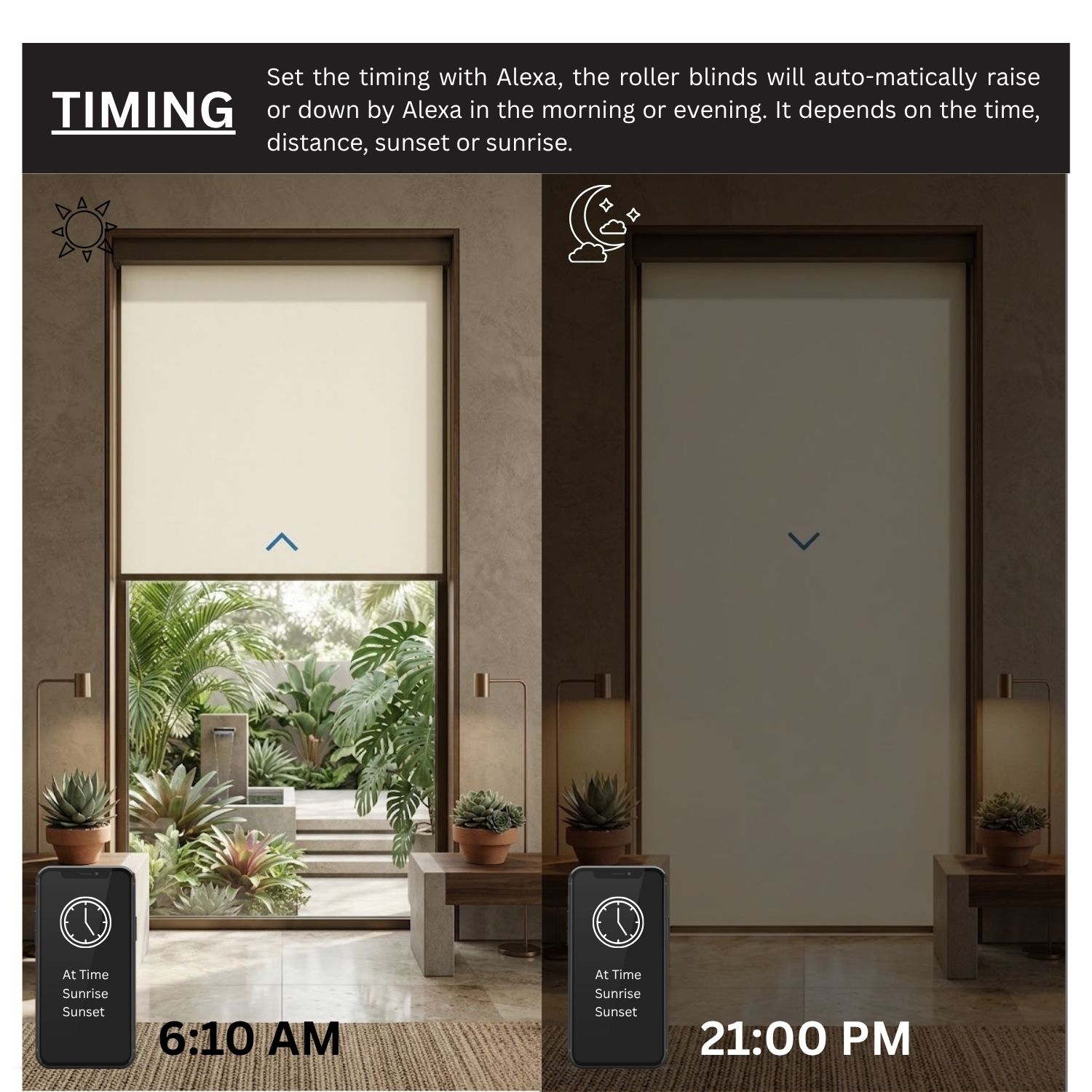 Seamlessly sync your shades with other Matter-certified devices for an integrated home experience. With the Sunrise/Sunset mode, your blinds can rise with the morning light and close at dusk, aligning naturally with your daily rhythm.