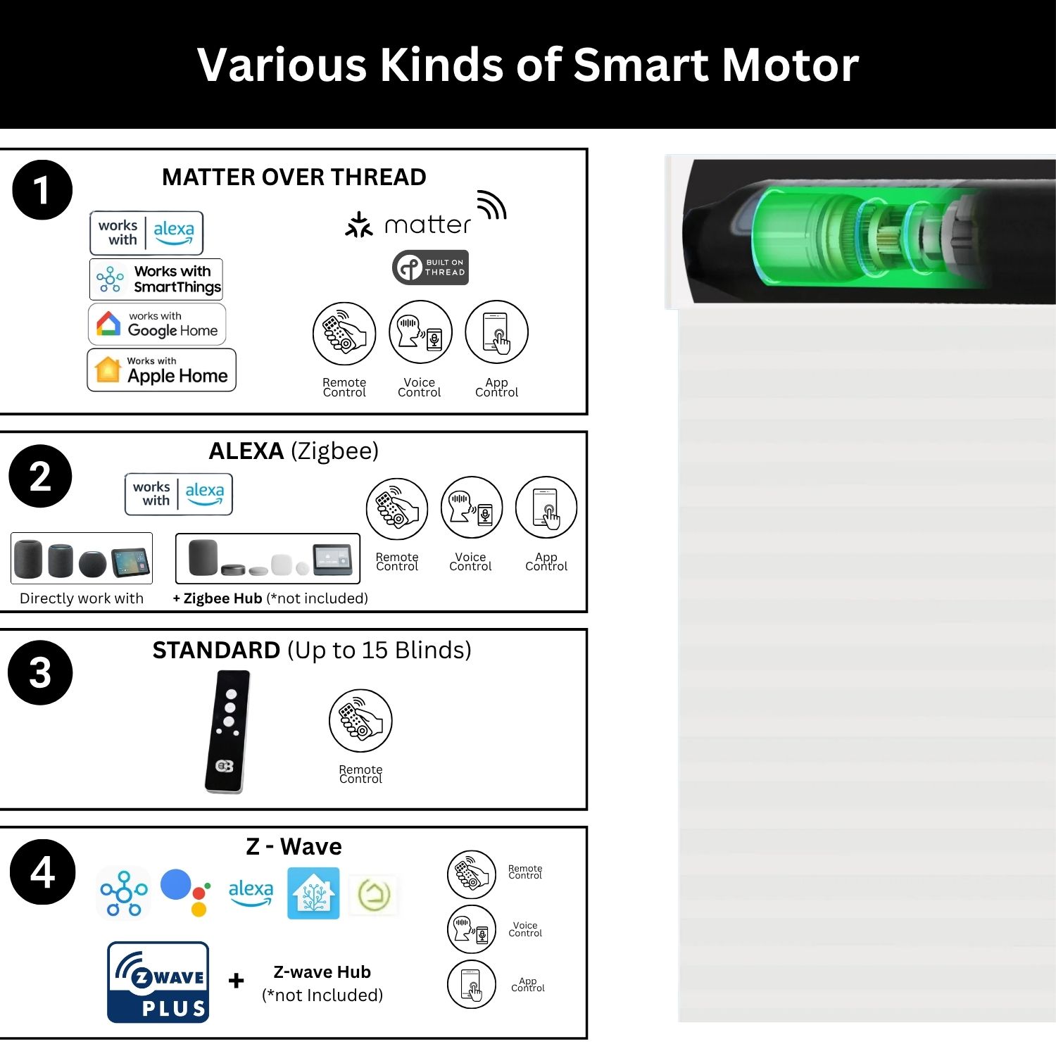At Coastal Smart Blinds, we offer a versatile selection of motorized systems designed to integrate effortlessly with your smart home. Our Zigbee and Z-Wave motor options are compatible with leading platforms like Samsung SmartThings, Home Assistant, and Hubitat, giving you simple, centralized control at your fingertips. At the heart of our technology lineup is the Matter motor, a next-generation solution built on the Matter over Thread protocol.