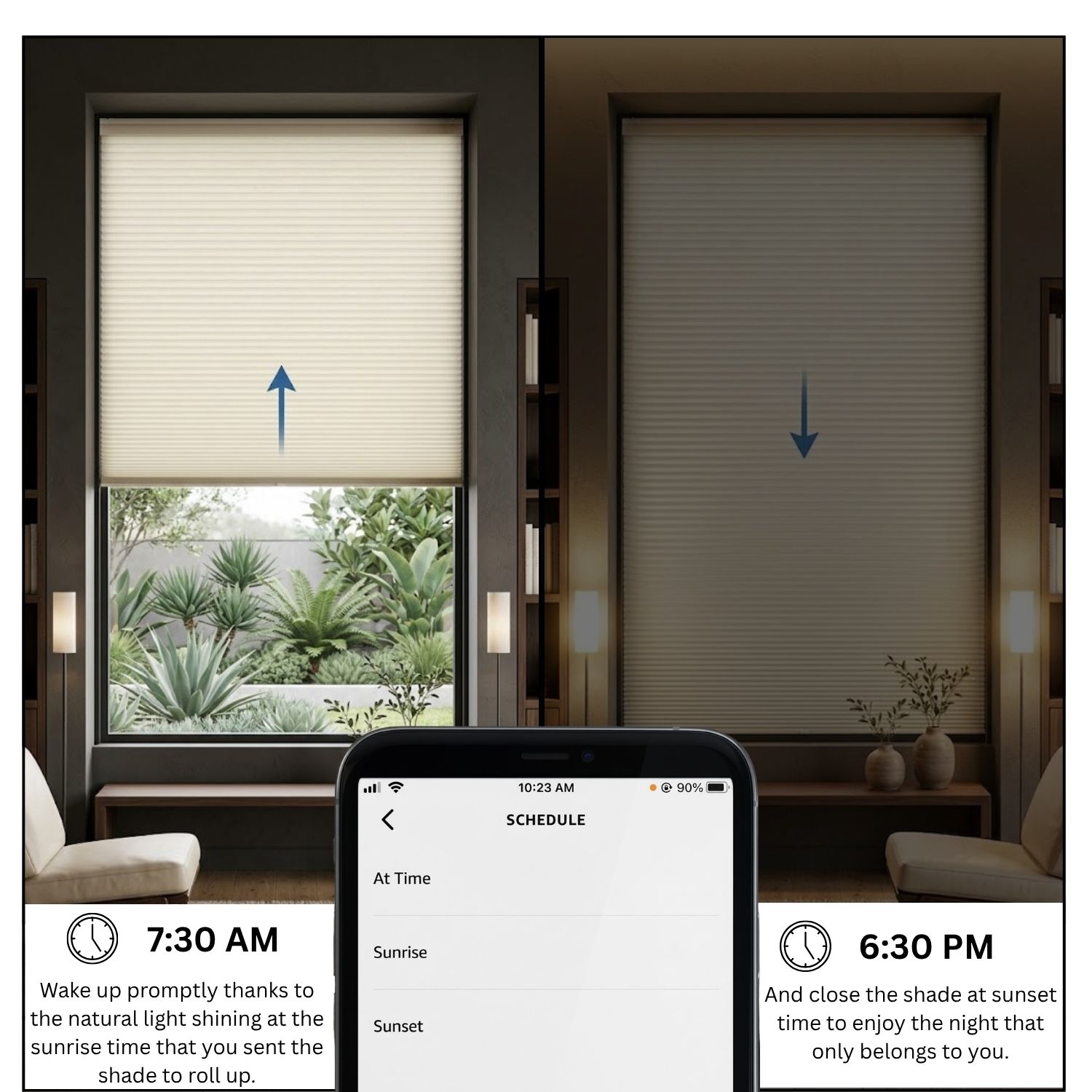 Seamlessly sync your shades with other Matter-certified devices for an integrated home experience. With the Sunrise/Sunset mode, your blinds can rise with the morning light and close at dusk, aligning naturally with your daily rhythm.