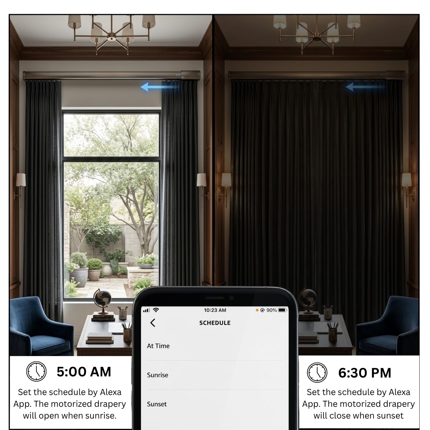 Seamlessly sync your shades with other Matter-certified devices for an integrated home experience. With the Sunrise/Sunset mode, your blinds can rise with the morning light and close at dusk, aligning naturally with your daily rhythm.