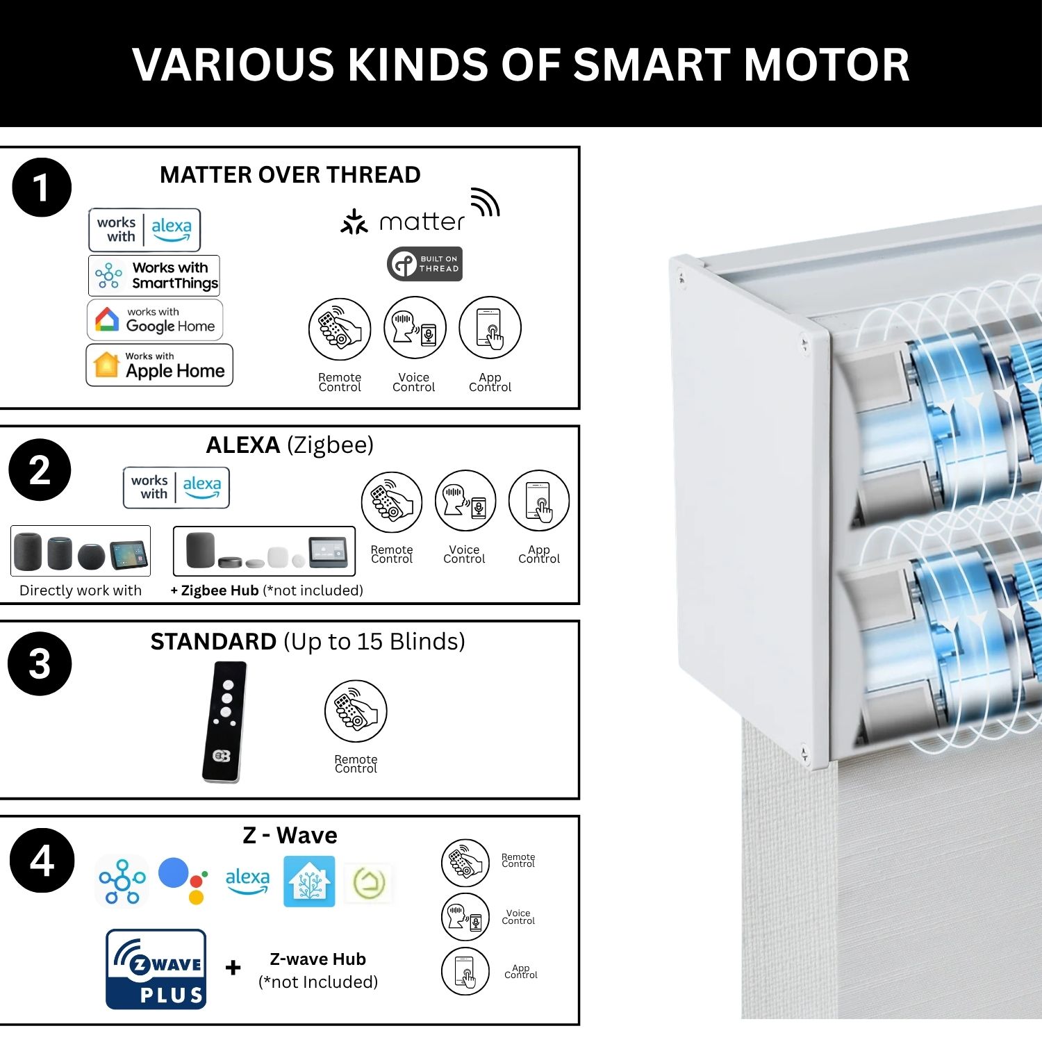 At Coastal Smart Blinds, we offer a versatile selection of motorized systems designed to integrate effortlessly with your smart home. Our Zigbee and Z-Wave motor options are compatible with leading platforms like Samsung SmartThings, Home Assistant, and Hubitat, giving you simple, centralized control at your fingertips. At the heart of our technology lineup is the Matter motor, a next-generation solution built on the Matter over Thread protocol.