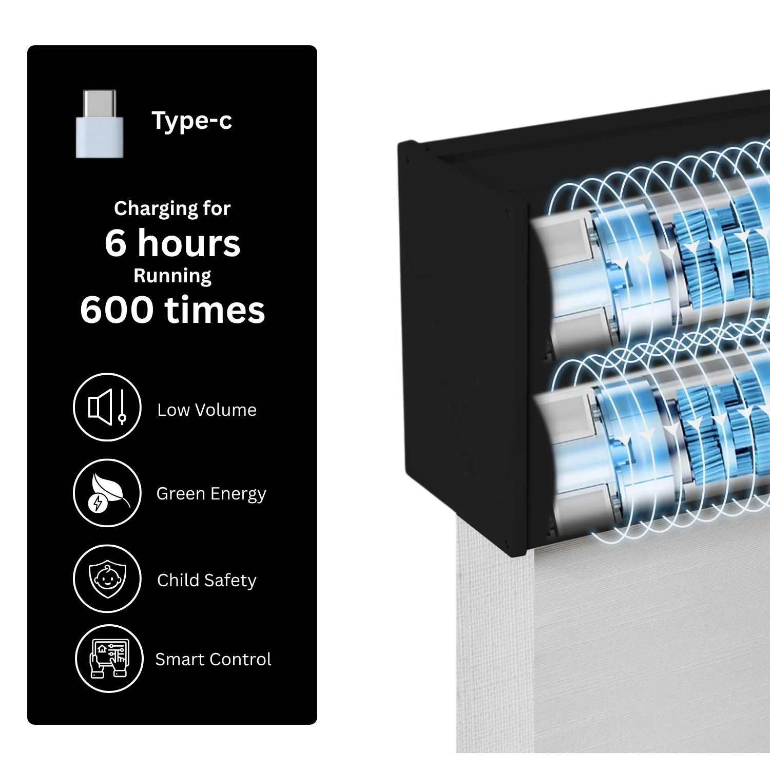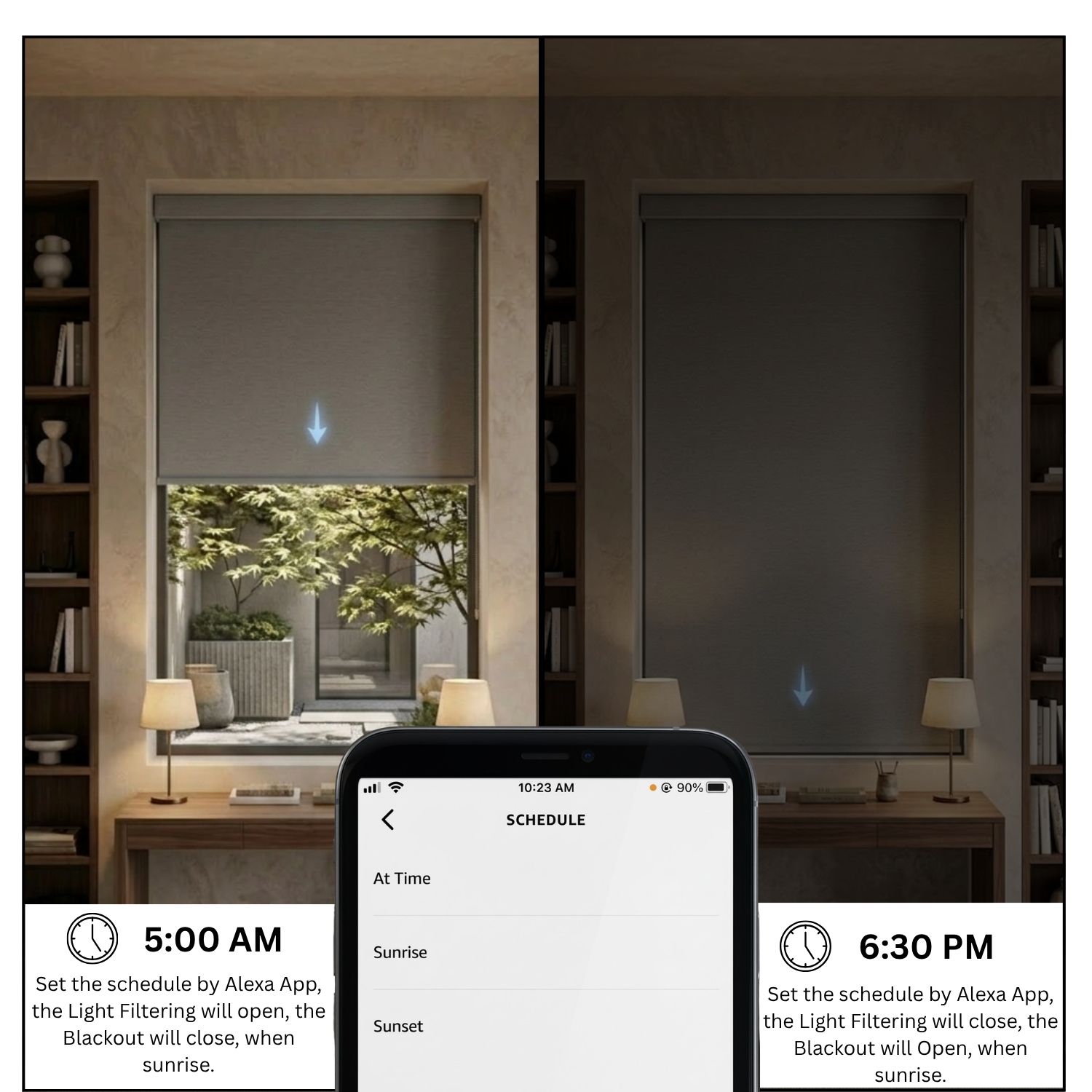 Seamlessly sync your shades with other Matter-certified devices for an integrated home experience. With the Sunrise/Sunset mode, your blinds can rise with the morning light and close at dusk, aligning naturally with your daily rhythm.