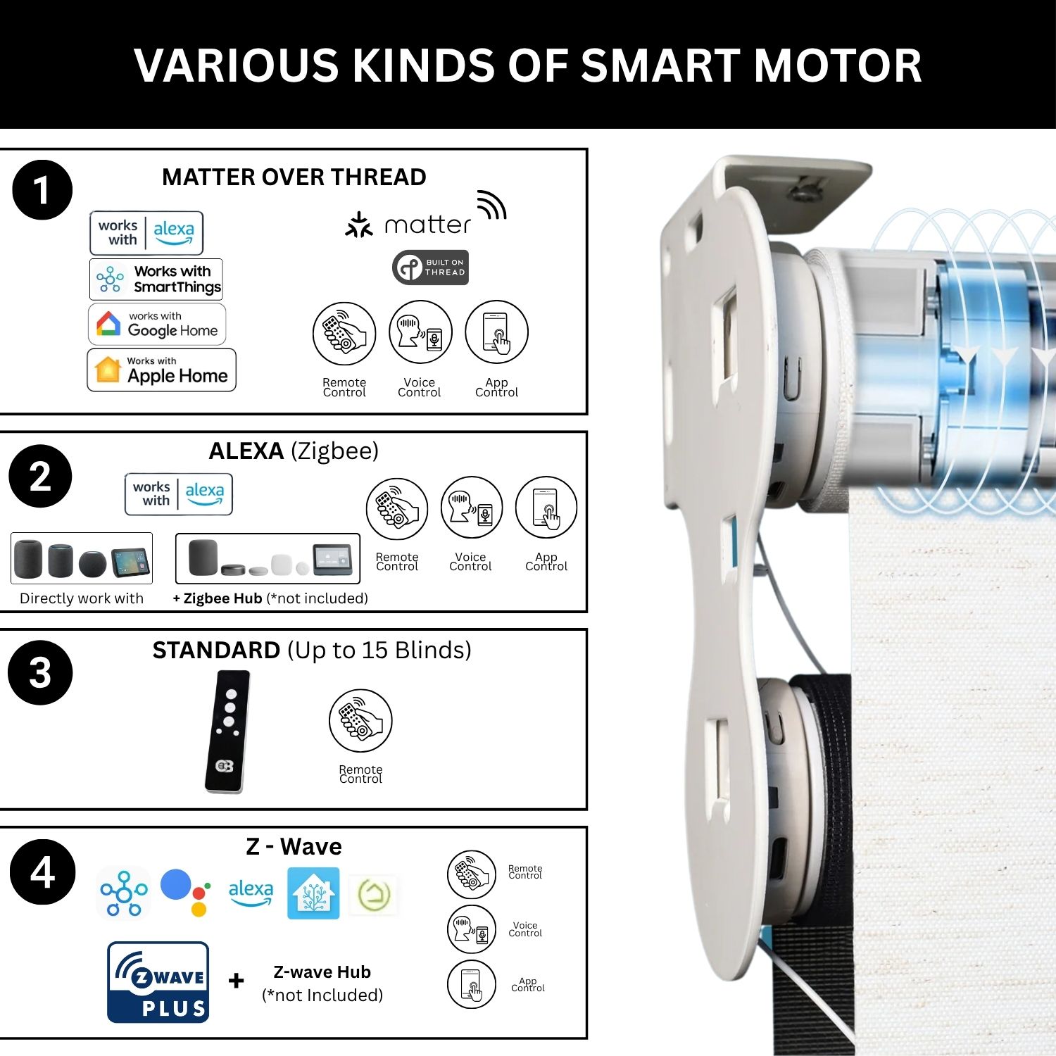 At Coastal Smart Blinds, we offer a versatile selection of motorized systems designed to integrate effortlessly with your smart home. Our Zigbee and Z-Wave motor options are compatible with leading platforms like Samsung SmartThings, Home Assistant, and Hubitat, giving you simple, centralized control at your fingertips. At the heart of our technology lineup is the Matter motor, a next-generation solution built on the Matter over Thread protocol.
