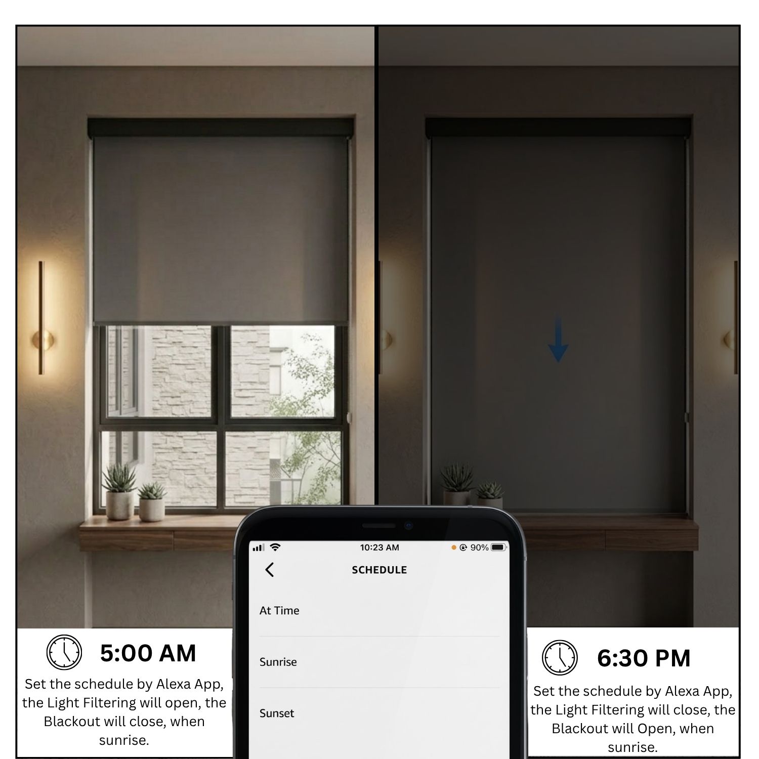Seamlessly sync your shades with other Matter-certified devices for an integrated home experience. With the Sunrise/Sunset mode, your blinds can rise with the morning light and close at dusk, aligning naturally with your daily rhythm.
