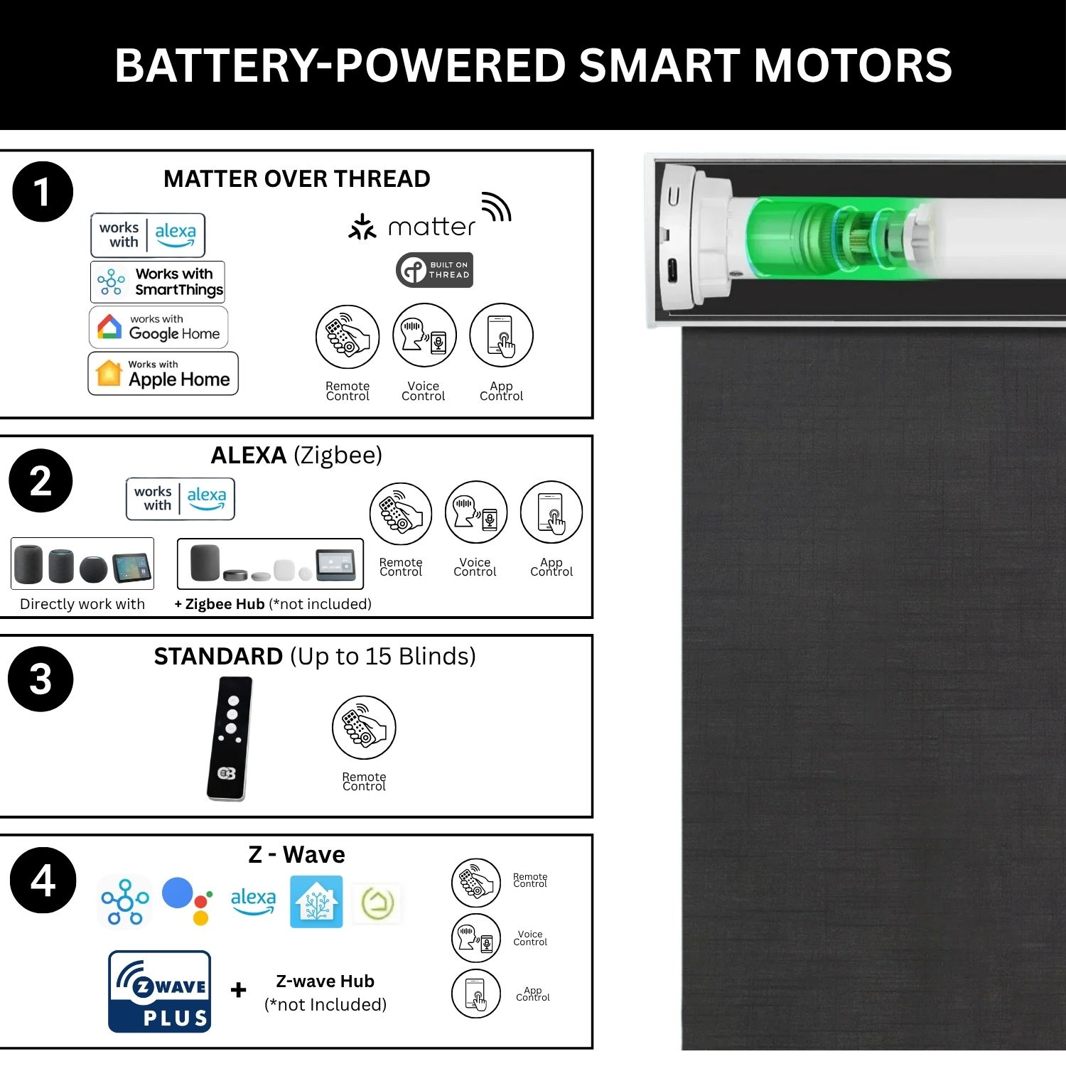 At Coastal Smart Blinds, we offer a versatile selection of motorized systems designed to integrate effortlessly with your smart home. Our Zigbee and Z-Wave motor options are compatible with leading platforms like Samsung SmartThings, Home Assistant, and Hubitat, giving you simple, centralized control at your fingertips. At the heart of our technology lineup is the Matter motor, a next-generation solution built on the Matter over Thread protocol.