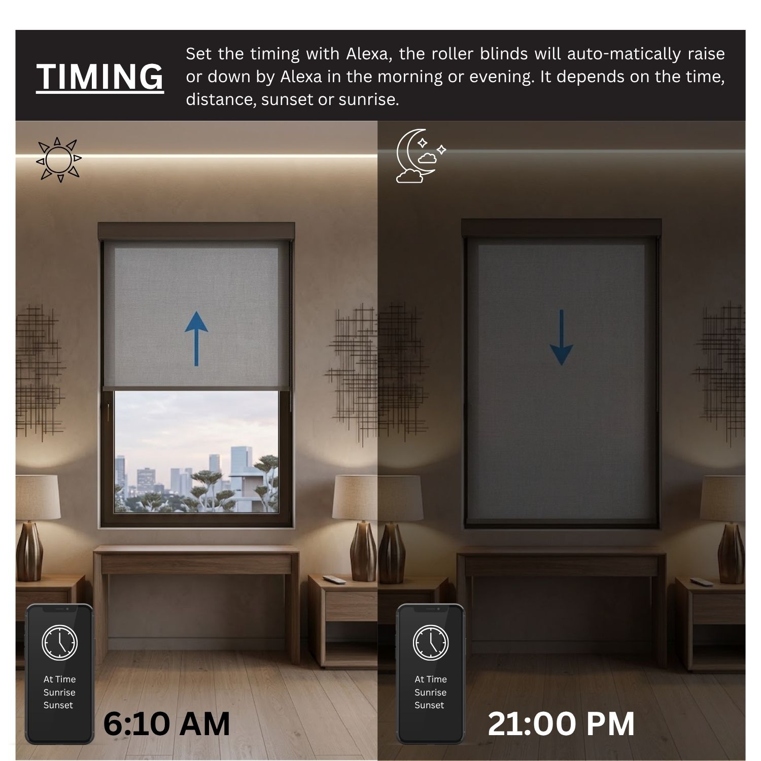 Seamlessly sync your shades with other Matter-certified devices for an integrated home experience. With the Sunrise/Sunset mode, your blinds can rise with the morning light and close at dusk, aligning naturally with your daily rhythm.