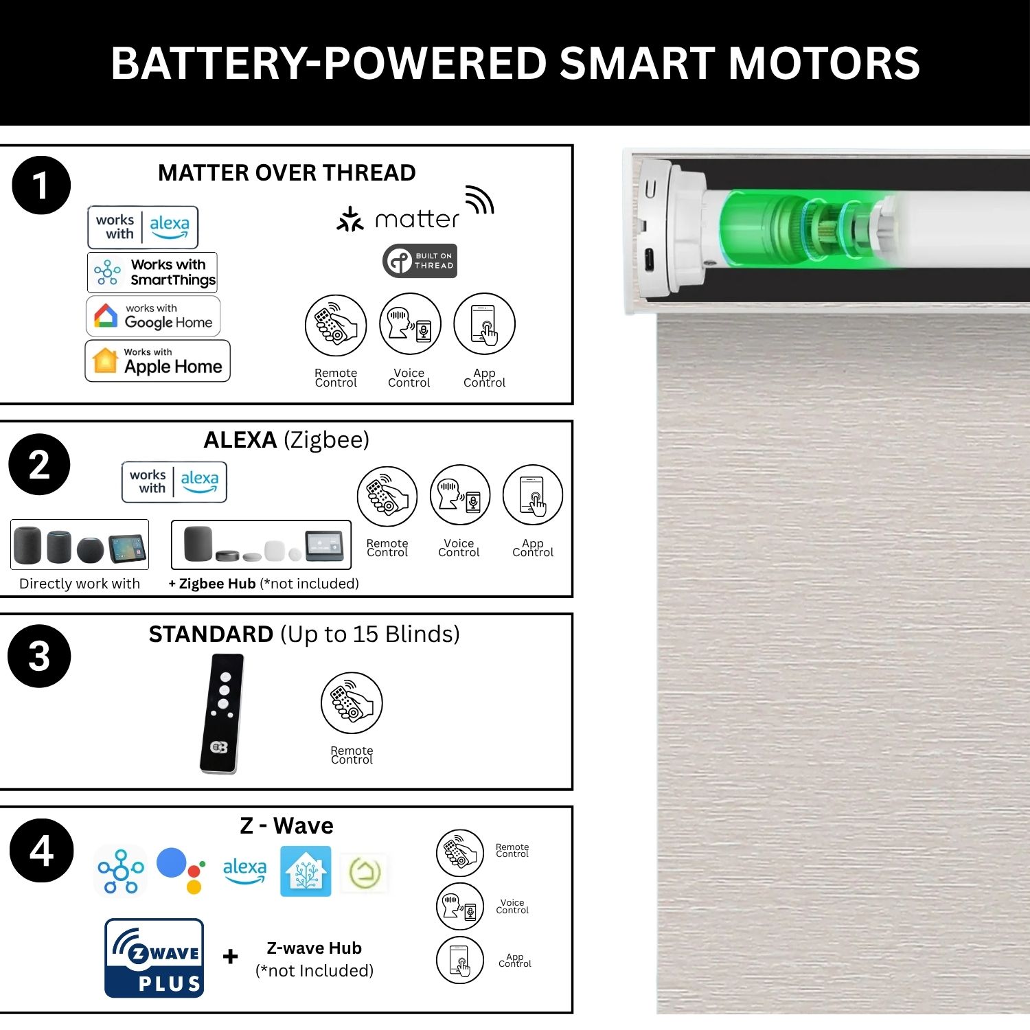 At Coastal Smart Blinds, we offer a versatile selection of motorized systems designed to integrate effortlessly with your smart home. Our Zigbee and Z-Wave motor options are compatible with leading platforms like Samsung SmartThings, Home Assistant, and Hubitat, giving you simple, centralized control at your fingertips. At the heart of our technology lineup is the Matter motor, a next-generation solution built on the Matter over Thread protocol.