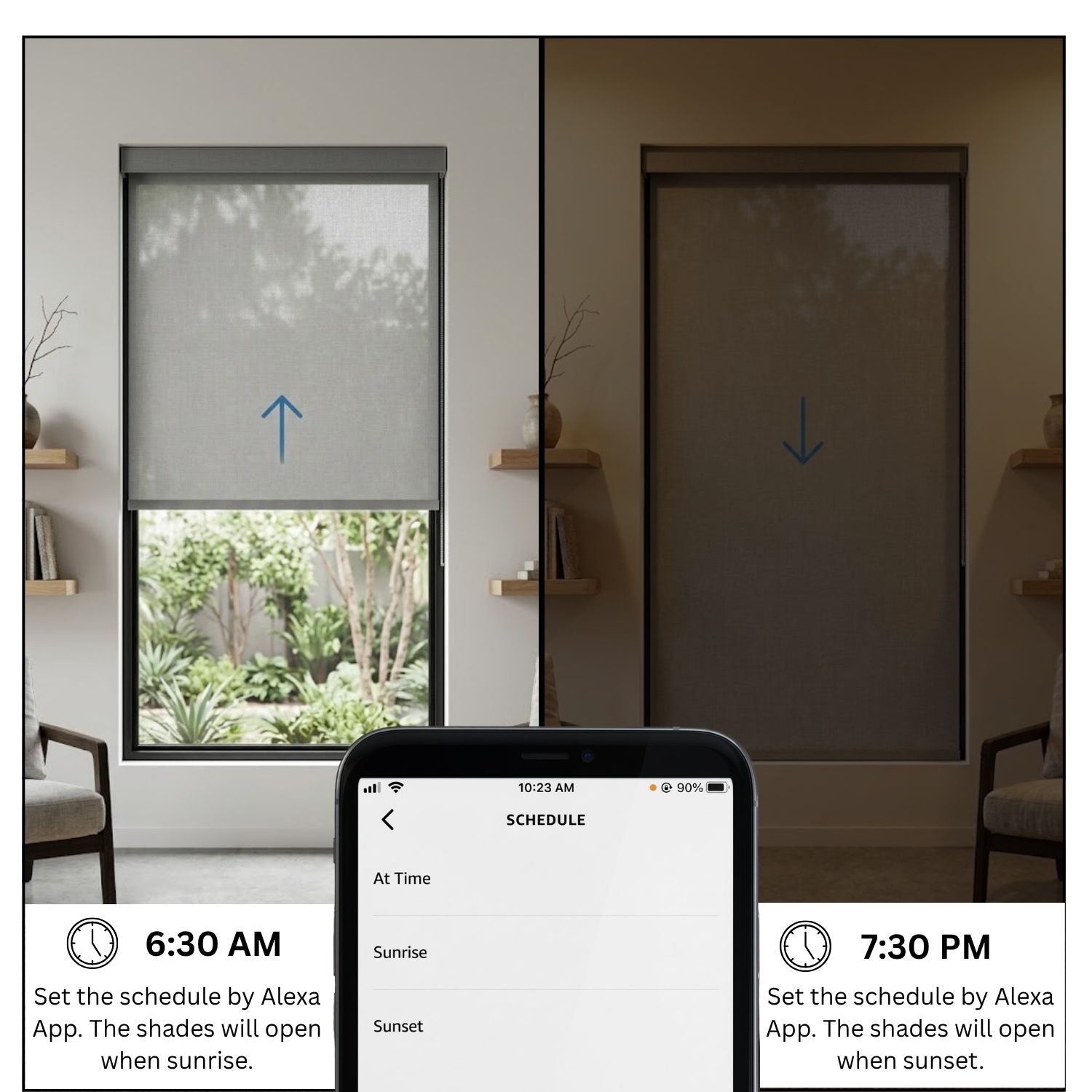 Seamlessly sync your shades with other Matter-certified devices for an integrated home experience. With the Sunrise/Sunset mode, your blinds can rise with the morning light and close at dusk, aligning naturally with your daily rhythm.