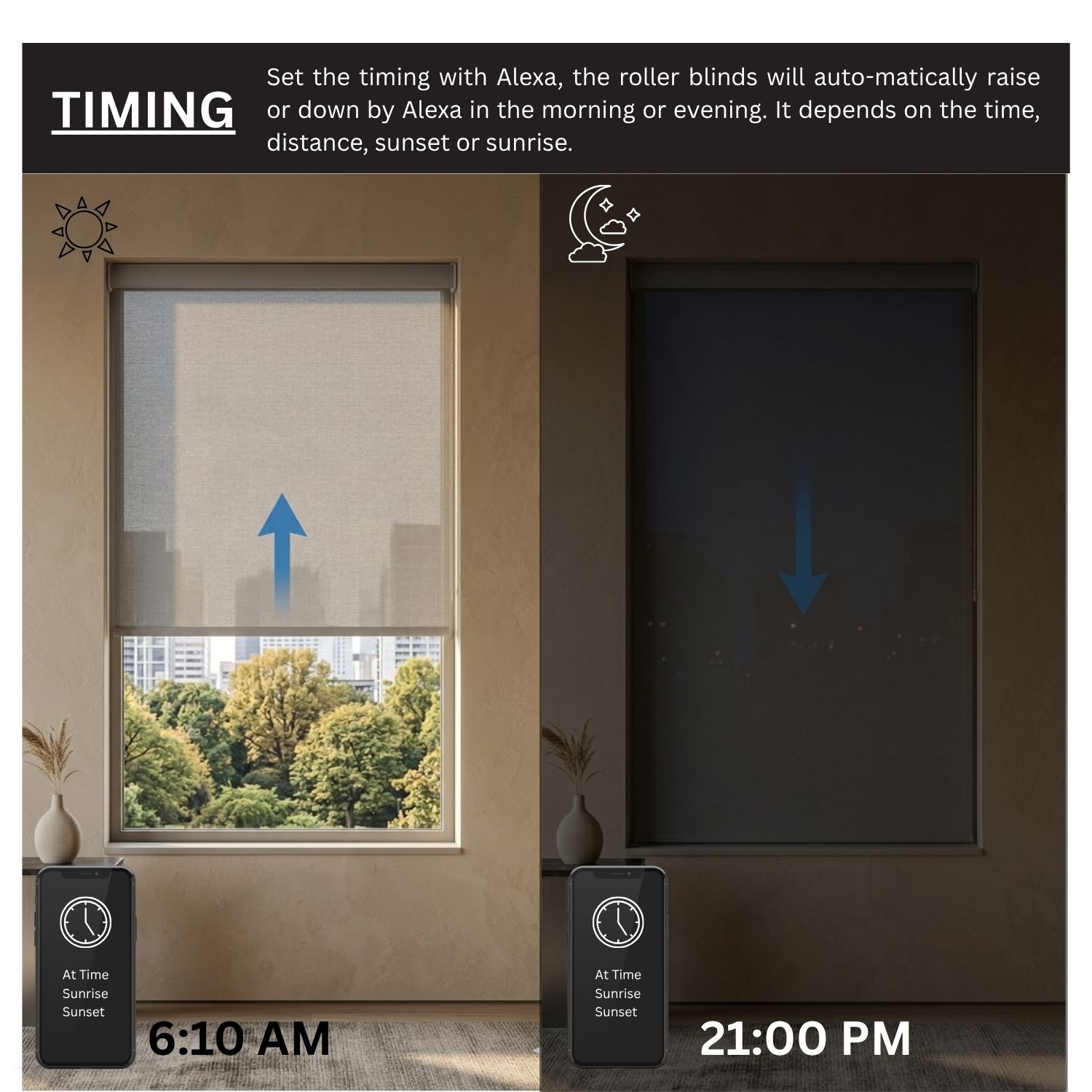 Seamlessly sync your shades with other Matter-certified devices for an integrated home experience. With the Sunrise/Sunset mode, your blinds can rise with the morning light and close at dusk, aligning naturally with your daily rhythm.