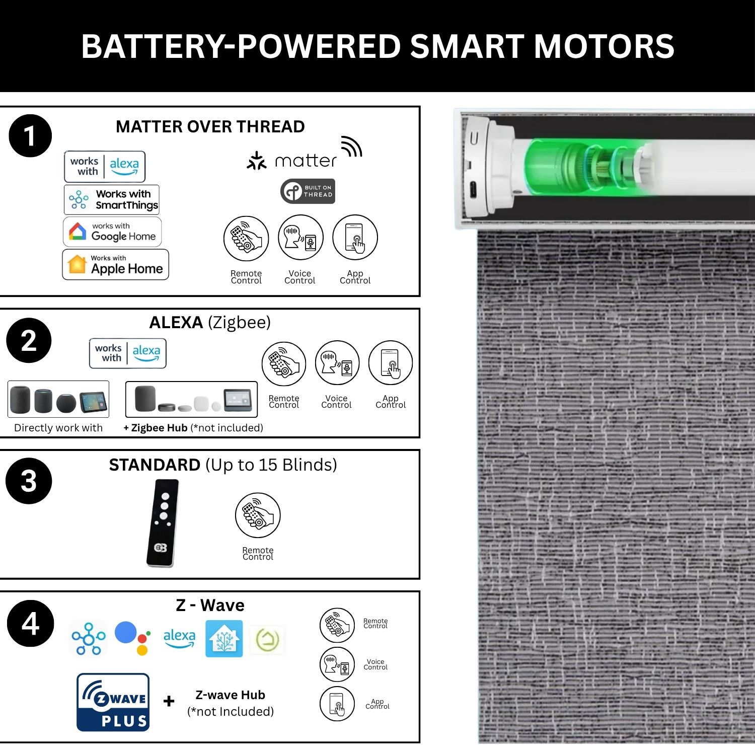 At Coastal Smart Blinds, we offer a versatile selection of motorized systems designed to integrate effortlessly with your smart home. Our Zigbee and Z-Wave motor options are compatible with leading platforms like Samsung SmartThings, Home Assistant, and Hubitat, giving you simple, centralized control at your fingertips. At the heart of our technology lineup is the Matter motor, a next-generation solution built on the Matter over Thread protocol.