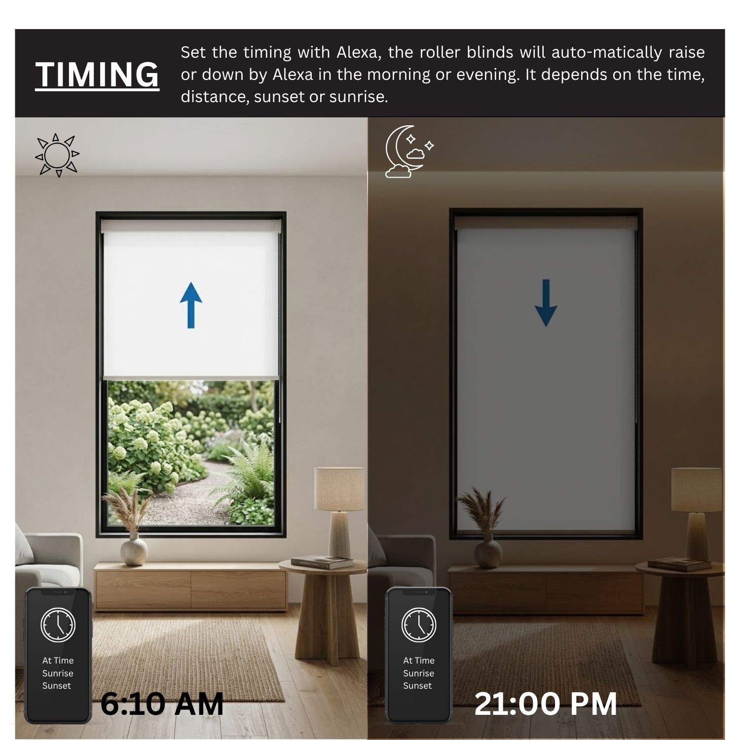 Seamlessly sync your shades with other Matter-certified devices for an integrated home experience. With the Sunrise/Sunset mode, your blinds can rise with the morning light and close at dusk, aligning naturally with your daily rhythm.