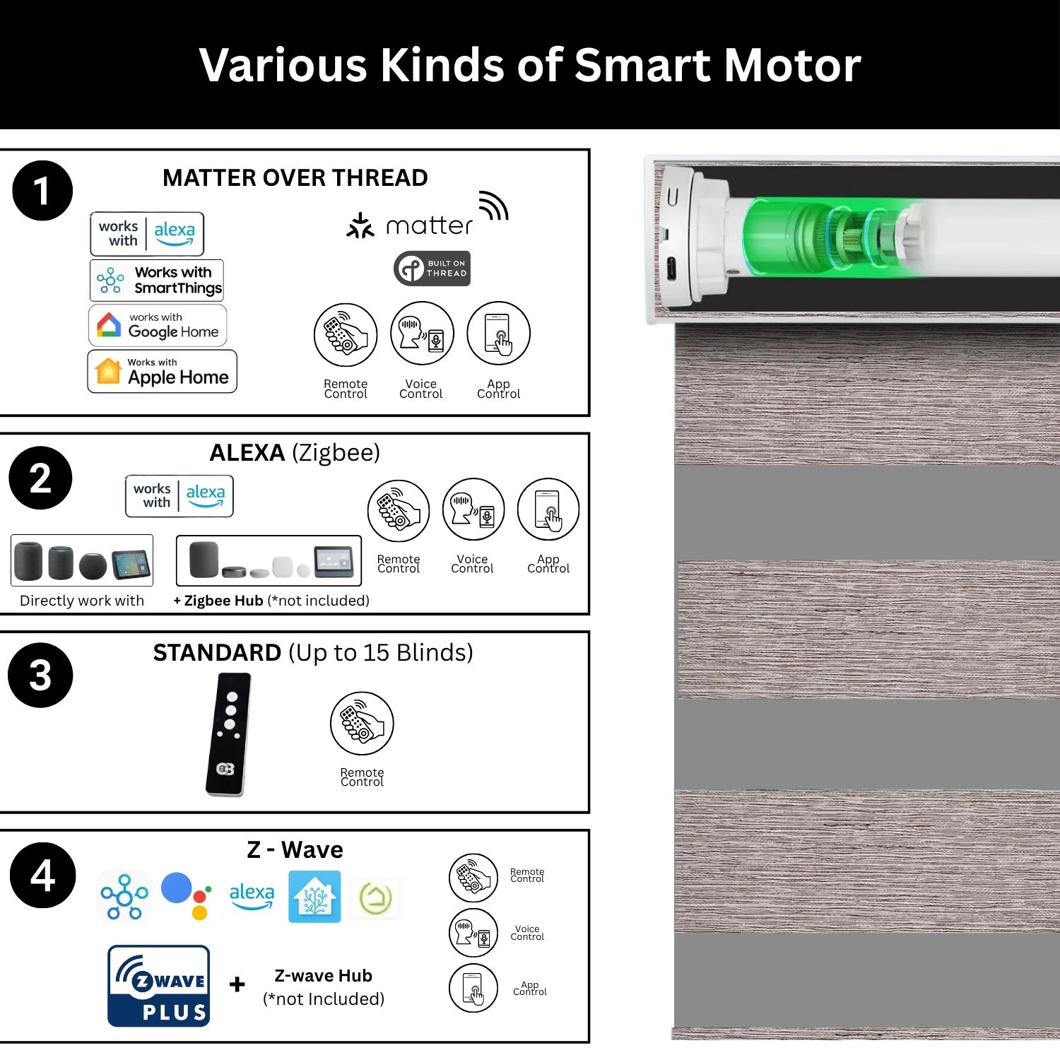 At Coastal Smart Blinds, we offer a versatile selection of motorized systems designed to integrate effortlessly with your smart home. Our Zigbee and Z-Wave motor options are compatible with leading platforms like Samsung SmartThings, Home Assistant, and Hubitat, giving you simple, centralized control at your fingertips. At the heart of our technology lineup is the Matter motor, a next-generation solution built on the Matter over Thread protocol.
