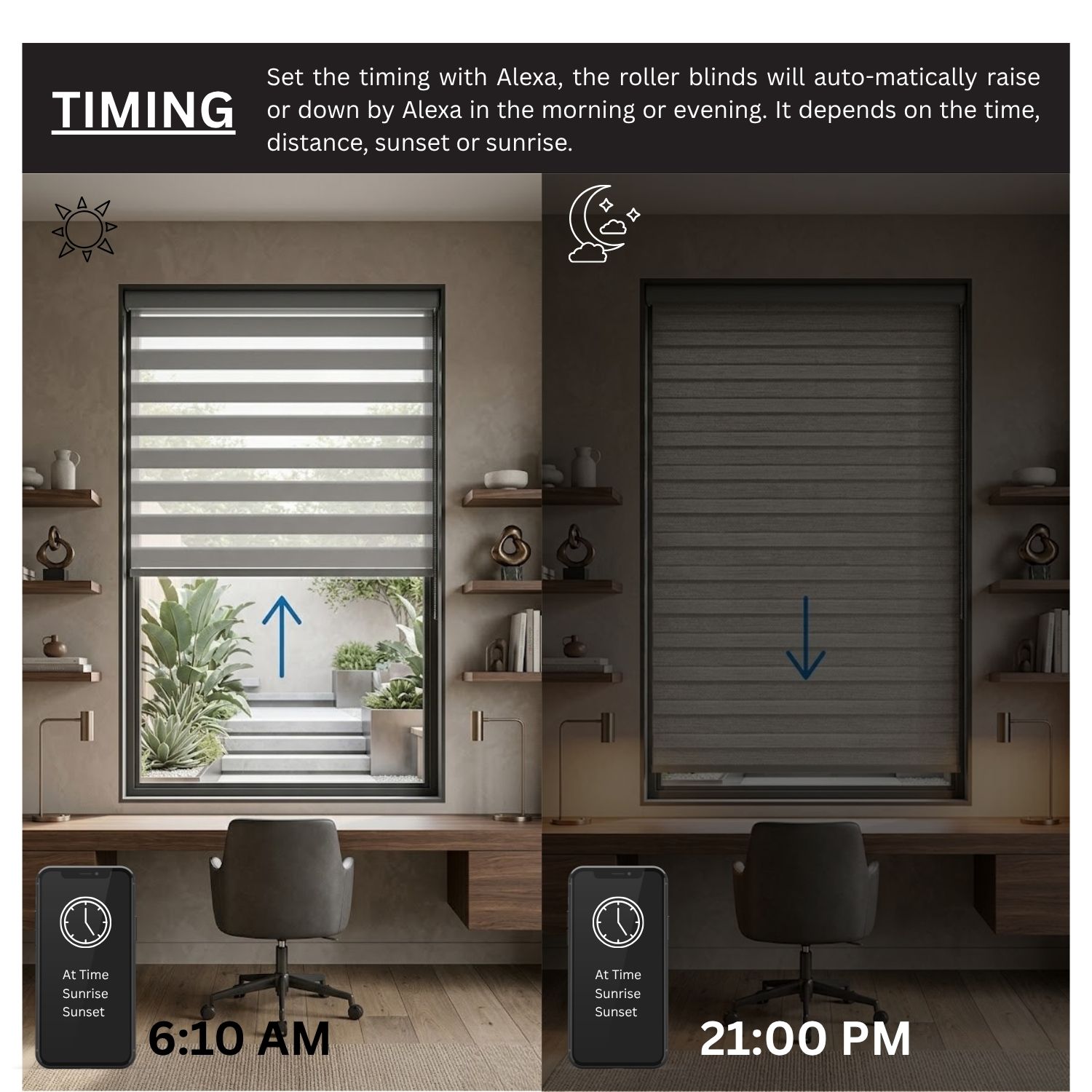 Seamlessly sync your shades with other Matter-certified devices for an integrated home experience. With the Sunrise/Sunset mode, your blinds can rise with the morning light and close at dusk, aligning naturally with your daily rhythm.