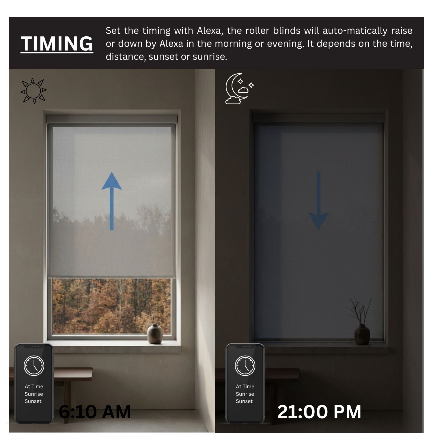 Seamlessly sync your shades with other Matter-certified devices for an integrated home experience. With the Sunrise/Sunset mode, your blinds can rise with the morning light and close at dusk, aligning naturally with your daily rhythm.