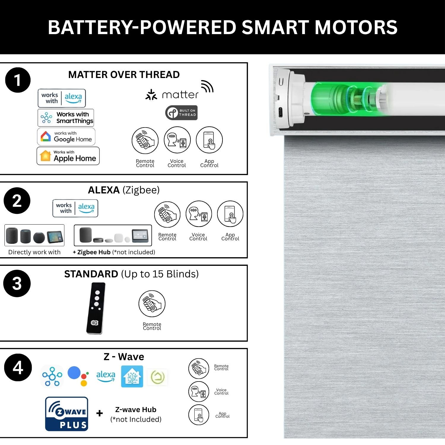 At Coastal Smart Blinds, we offer a versatile selection of motorized systems designed to integrate effortlessly with your smart home. Our Zigbee and Z-Wave motor options are compatible with leading platforms like Samsung SmartThings, Home Assistant, and Hubitat, giving you simple, centralized control at your fingertips. At the heart of our technology lineup is the Matter motor, a next-generation solution built on the Matter over Thread protocol.